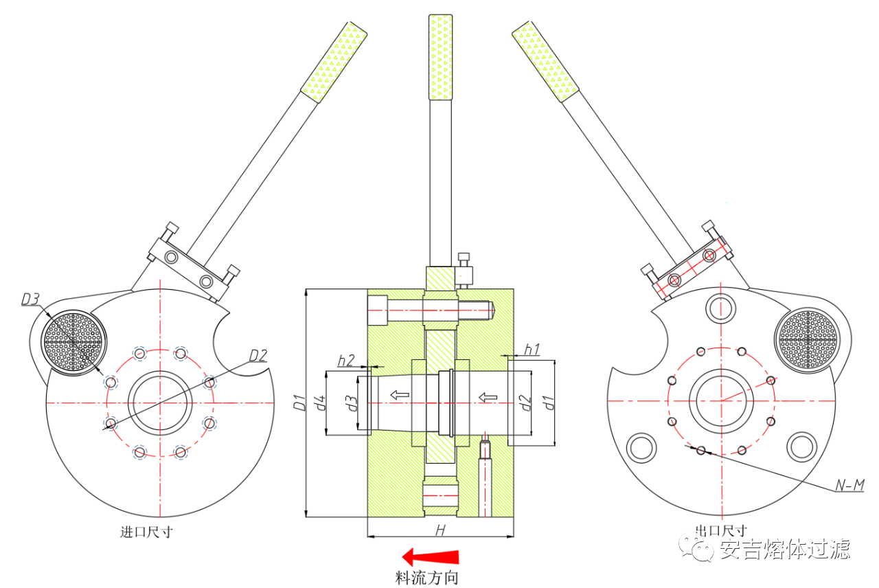 手动式换网器在移动滑板上开有两个供聚合物介质流动的通道,通过手动切换装置(板杆)两个工作位交替进入工作状态,通过滤网对聚合物介质进行过滤,依次清洁介质,生产高质量的制品。换网器安装于挤出机和模具之间。