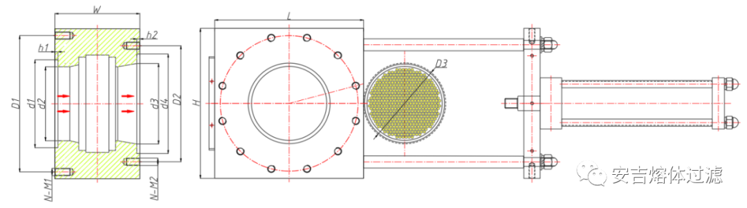 单板双工位液压换网器由换网器机体、滑板、液压缸、保温板等基本组件组成。在换网器滑板上开有2个过滤通道,内镶装过滤多孔板(过滤网板),2个多孔板在液压系统的作用下,可交替进入工作位及换网位。