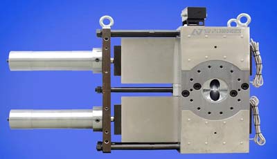 双柱双工位液压换网器,性能显著提高,在线换网,不中断料流。